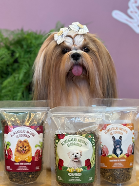 Ingredientes: Carne bovina, coração bovino, arroz parboilizado, abobrinha, abóbora, fígado, mandioca, couve, banana, salsinha, suplemento vitamínico e mineral, óleo de coco, sal e orégano.